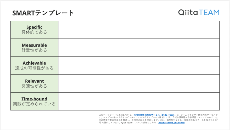 前章で紹介したSMARTの法則の他にも、目標設定で利用しやすいテンプレートを用意しました。