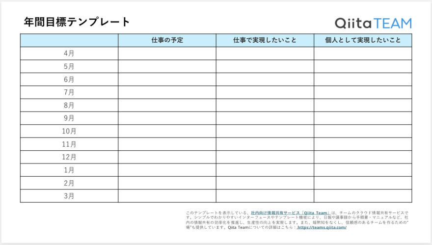 年間目標のテンプレートは、長期的な視野で目標を設定し、年単位での成長と達成を計画するために設計されています。このテンプレートを使用することで、1年間で達成したい大きな目標を明確に定義し、それを実現するための四半期ごとや月ごとのマイルストーンに分割することができます。年間目標テンプレートは、長期的なビジョンの実現に向けた戦略的なアプローチを支援し、途中での進捗確認や必要に応じた調整ができます。