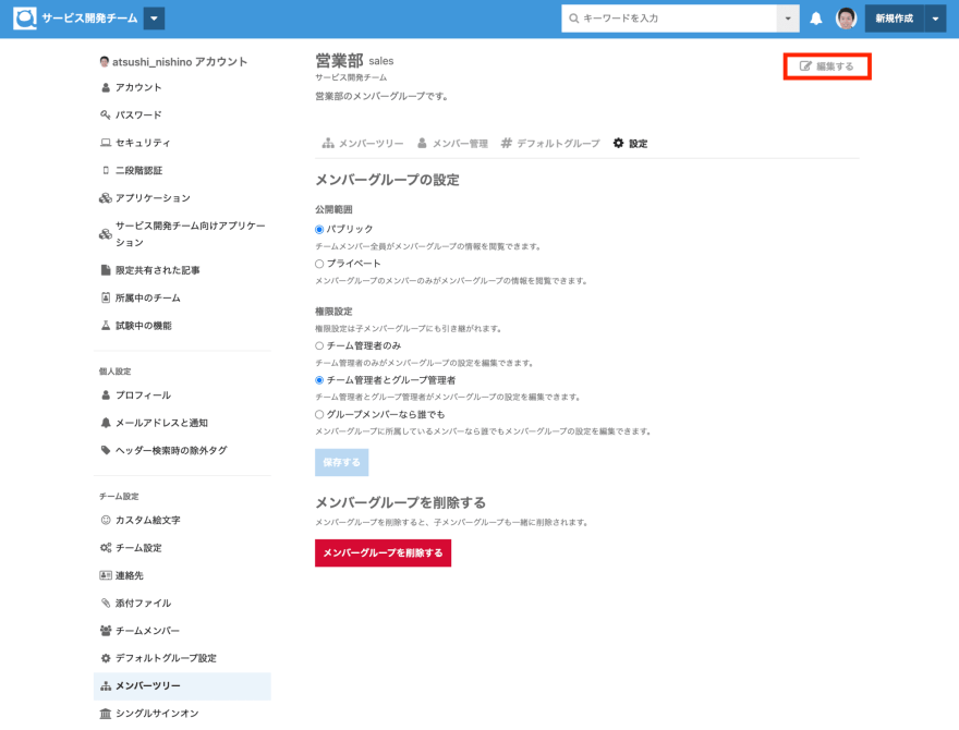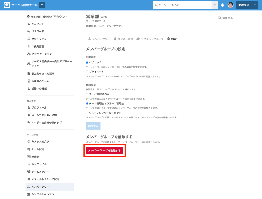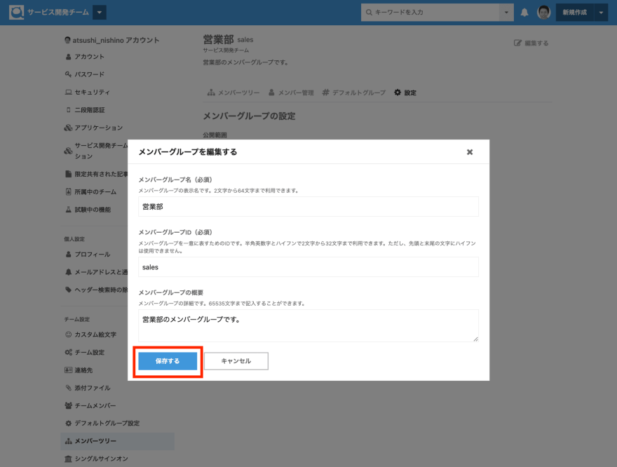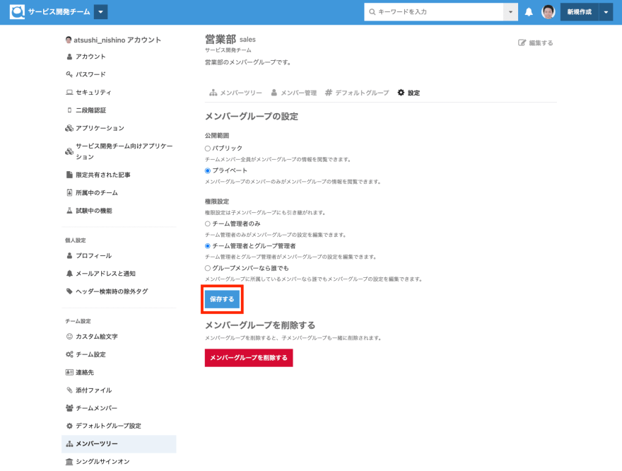 対象のメンバーグループの設定ページより、メンバーグループの公開範囲、および権限を変更後に 保存する ボタンを押下してください。