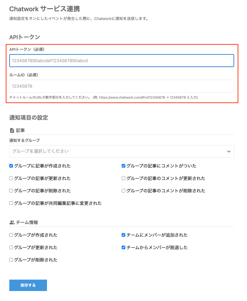 APIトークンの取得方法はChatworkの「APIトークンを発行する」をご覧ください。 - ルームIDを設定