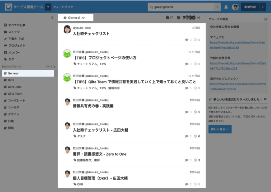 よくコミュニケーションを取るメンバーが発信する記事が一箇所にまとまっていると、情報をキャッチアップしやすく、スムーズに業務を進めることができるでしょう。