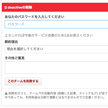 チームオーナーのパスワードを入力し、「このチームを削除する」ボタンをクリックすると、削除が実行されます。