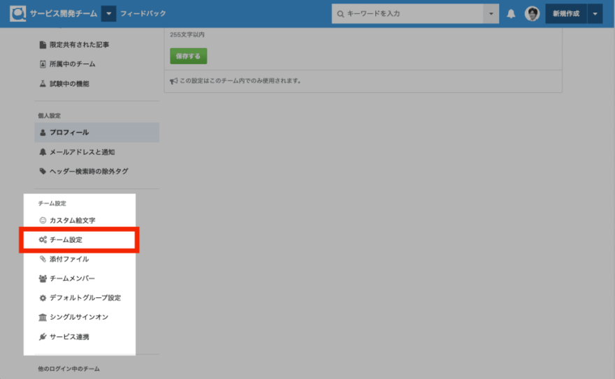 こちらから、チーム設定ページを開きます。