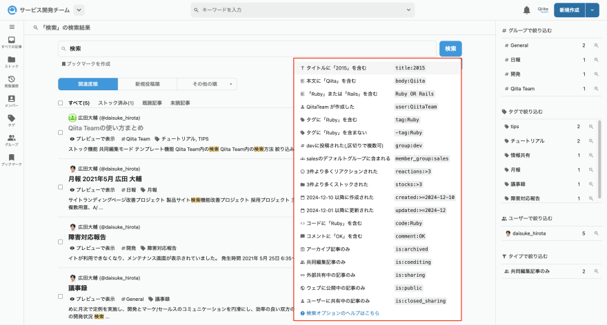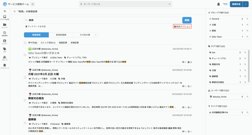 検索した記事はドロップダウンから「新着順」、「関連順」、「ストック順」に並び替えができます。