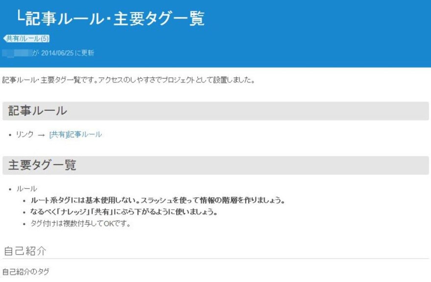 田中さん: あとは 「自己紹介」の記事を書いてもらう ことも工夫の一つです。 プロジェクトページに「はじめて来た人へ」というのをまとめていて、そこに 「自己紹介記事を書きましょう」 と書いています。そうすることで、 Qiita Teamに書く最初のきっかけを作っています。 これも結構数がたまってきて、だいたい自己紹介記事を探して見れば、 その人がどんな人で何に強い人なのか、というのが分かるような状況になっています。