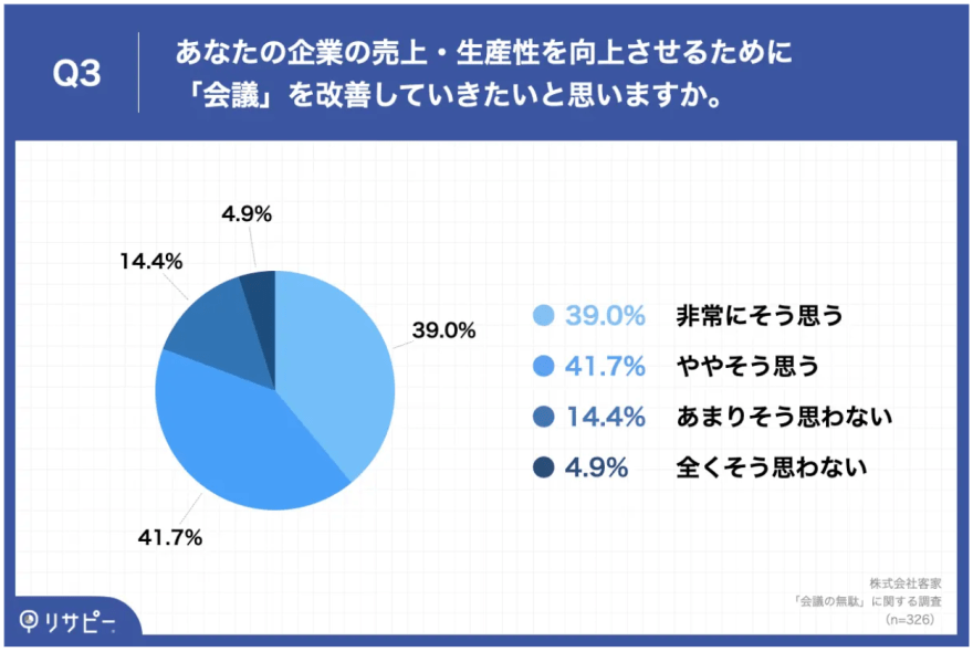 例えば、株式会社客家が「会議の無駄」に関する調査を実施したところ、約8割の企業が自社の売上や生産性を向上させるために、会議を改善したいと考えていることが分かりました。