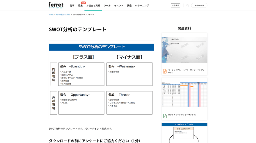 同じく「ferret(フェレット)」から入手できるのが、「SWOT分析テンプレート」です。パワーポイント形式のデータで縦軸が「プラス面」「マイナス面」で、横軸が「内部環境」「外部環境」となっています。ferretではさまざまなフレームワークのテンプレートが入手できるだけでなく、初心者にとって役立つ情報を日々配信しています。これからマーケティングを学ぶ担当者にとっては、ぜひチェックしておきたいメディアの一つといえるでしょう。