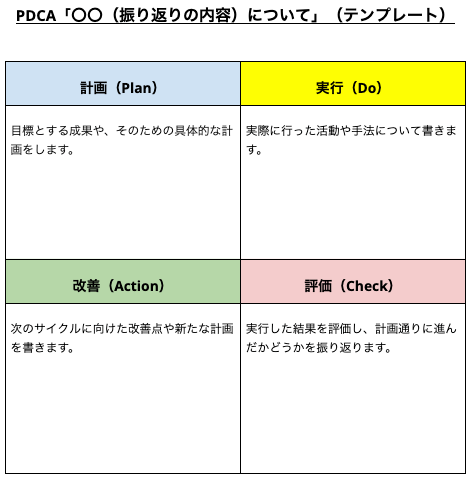 PDCAは4つのマスにそれぞれ、計画・実行・評価・改善を書き込みます。計画(Plan)には目標や具体的な計画、実行(Do)には実際に行った活動や手法、評価(Check)には実行した結果の評価、改善(Action)には次に実施する計画や改善策を記載しましょう。